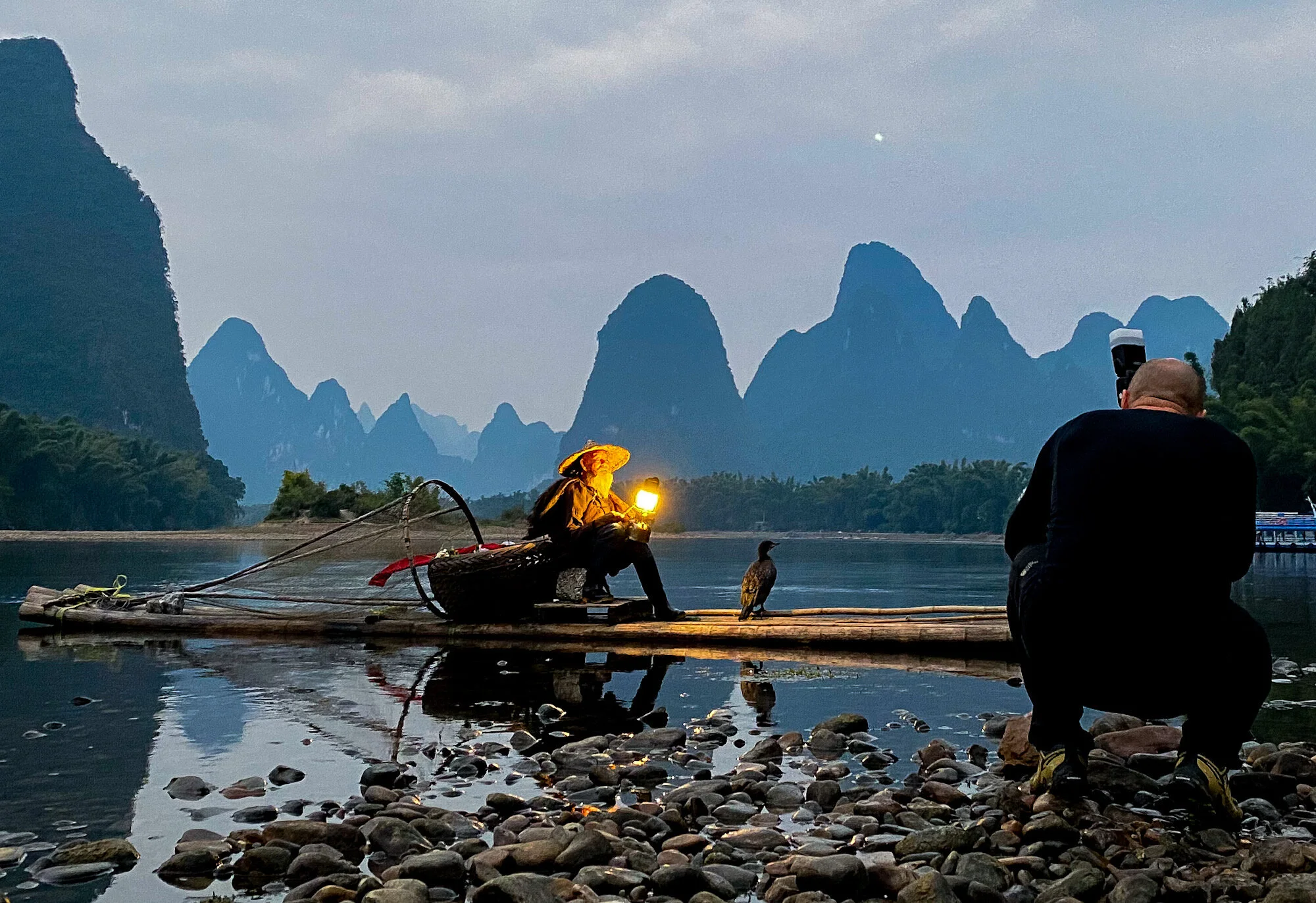 We had a very unique and special sunrise with a 92 year old fisherman the other day in China. This is a behind the scenes image of me shooting him with his Cormorant birds on his traditional bamboo raft.